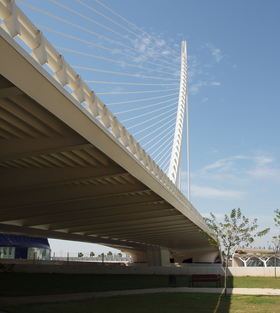 nombre Pont l’Assut de l’Or, Pont de la Serradora • fecha de construcción 2008 (Siglo XXI) • personas involucradas en diseño y construcción SANTIAGO CALATRAVA • ubicación aNTIGUO CAUCE DEL TURIA, VALENCIA, ESPAÑA • tipología Puente ATIRANTADO • estado En uso